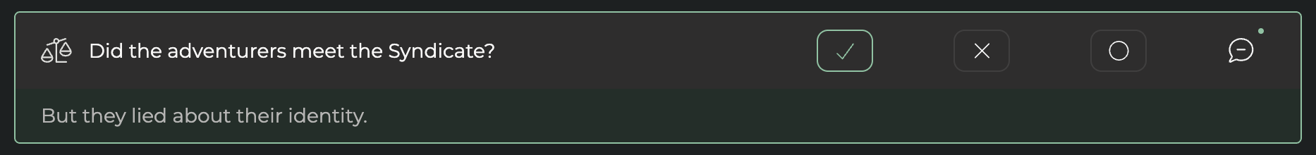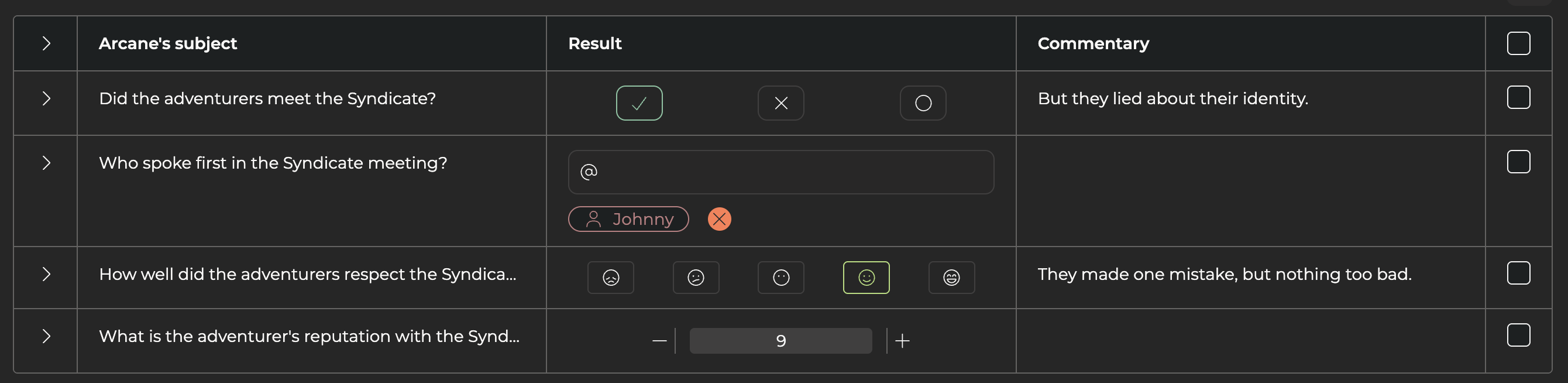 To use this feature to its fullest potential, create arcana and insert them in your narrative pages at all moments when they will prove useful — either because there is an opportunity to change their value (e.g. whenever the players could earn or lose reputation with the Syndicate), or because there is an opportunity to make their value have an impact (e.g. whenever having too low a reputation could lead to trouble for the players).