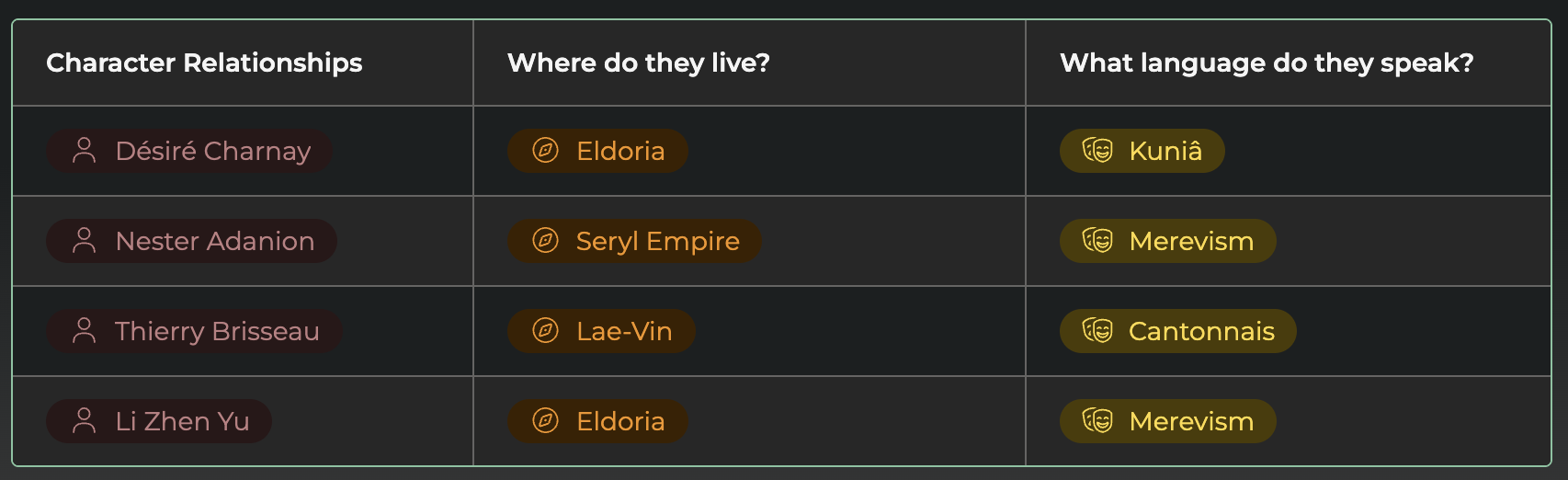 Rune tables are especially useful for player or NPC stats, abilities, and spells, but also for weapons, family links, and much more.