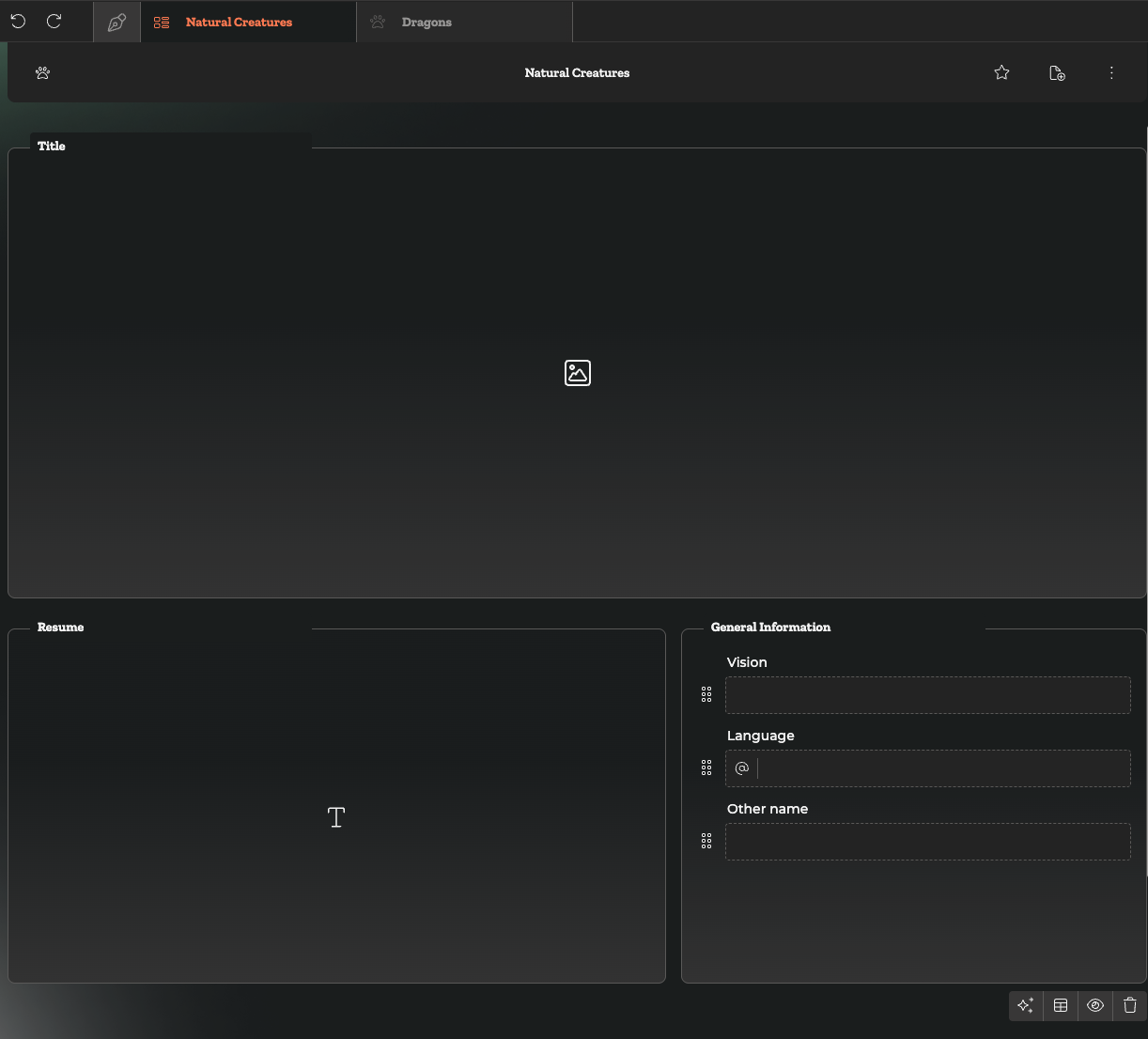Start by creating a new template called Elemental Creatures. Add the elements you want: an image, a mirror link to related characters, and a resume.