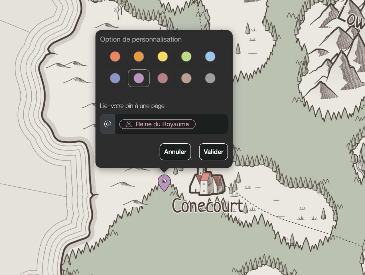 Il est maintenant temps d' ajouter des pins ! Vous pouvez choisir différentes couleurs pour rendre les éléments plus reconnaissables. Chaque pin créé peut être relié à une page . Ce mode de fonctionnement vous permet donc par exemple d’ expliquer l’histoire d’une ville, d’une région ou d’un personnage vivant à cet endroit.