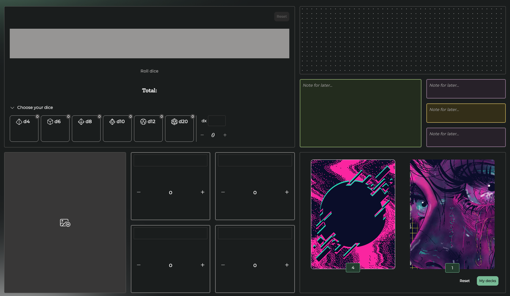 Par exemple, vous pouvez ajouter un pense-bête pour les petites notes, des compteurs pour les points, une zone de dessin pour illustrer des éléments, un outil de dés pour réaliser des lancés, mais également un module de cartes pour faire des tirages.